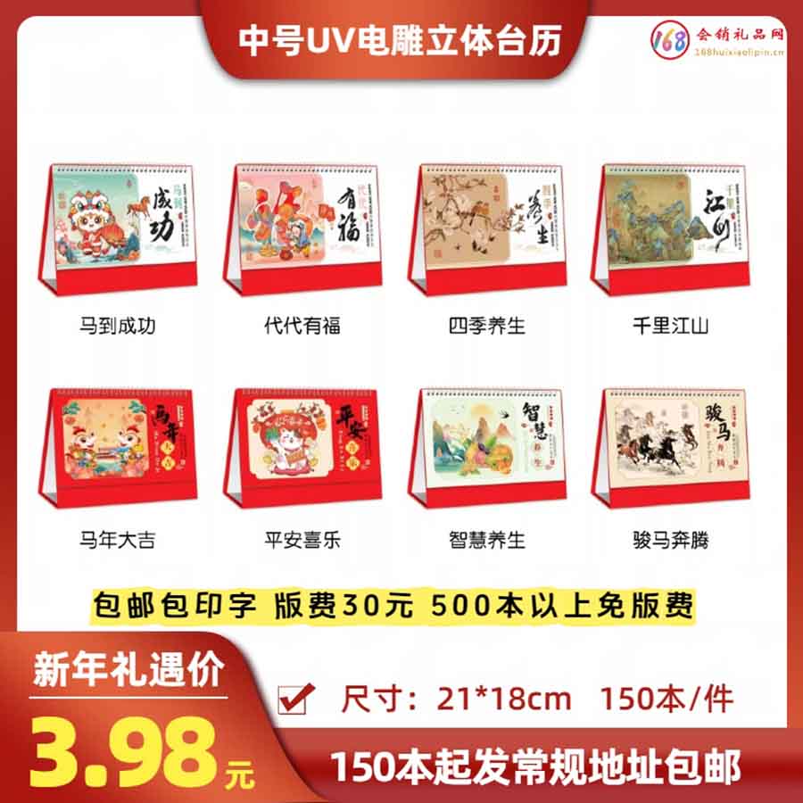 中号 UV 电雕立体台历,3.98 元,150 本起常规地址包邮。UV 电雕工艺,多款主题,包邮包印字,500本一下加版费 30元 ,新年办公装点超合适。