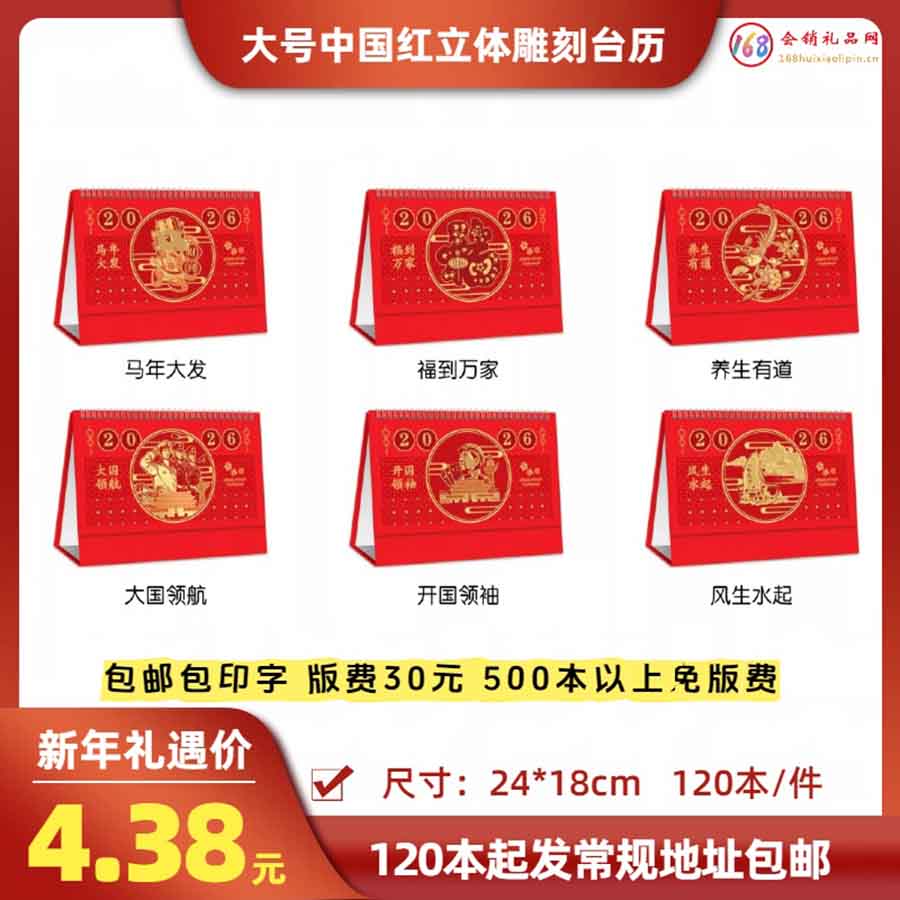 大号中国红立体雕刻台历,4.38 元起,120 本起常规地址包邮,500本一下加版费30元 新年礼遇,中国红立体雕刻,多款主题可选,印字还包邮,新年办公送礼佳选~