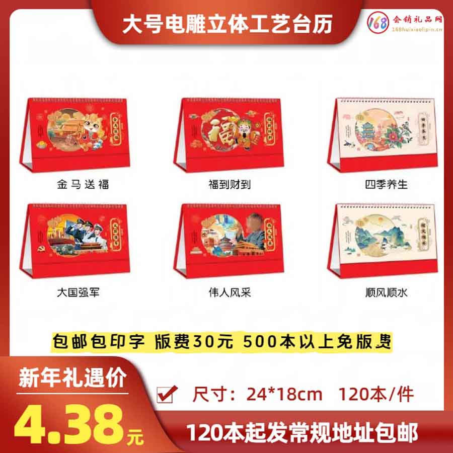 大号电雕立体工艺台历,4.38 元起,120 本起常规地址包邮,新年礼遇,电雕立体工艺,多款主题可选,印字包邮,500本一下加 30元版费 新年办公馈赠优选~