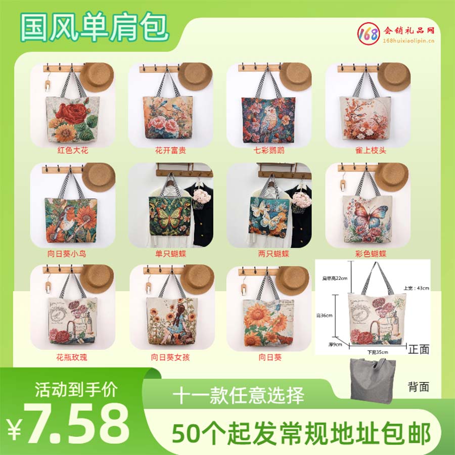 “国风单肩包,活动到手价 7.58 元 / 个,50 个起发常规地址包邮!十一款花色任意选,