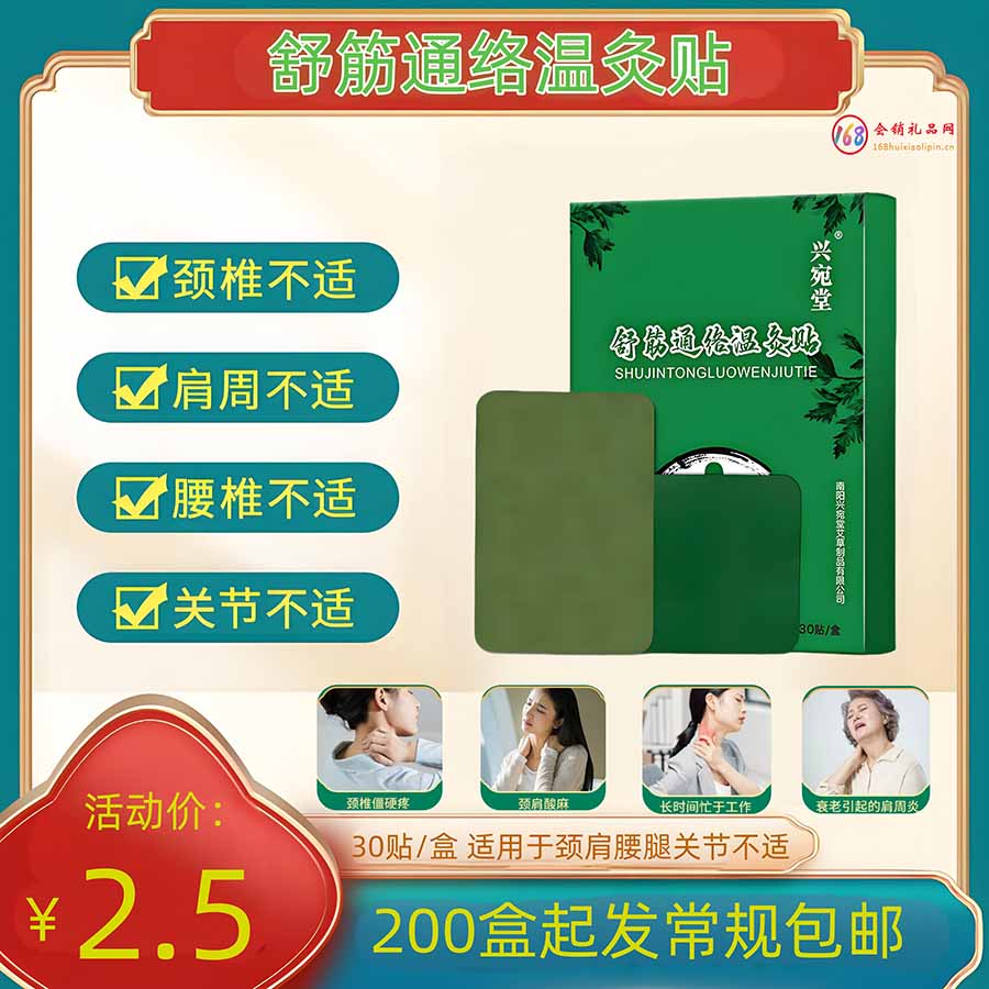 “舒筋通络温灸贴” 专攻颈椎、肩周、腰椎、关节不适,每盒含 30 贴,现在活动价仅 2.5 元 / 盒,200 盒起发还能常规包邮~不管是颈肩酸胀还是腰腿不适,贴上它舒缓更轻松,量大价优,实用又划算!