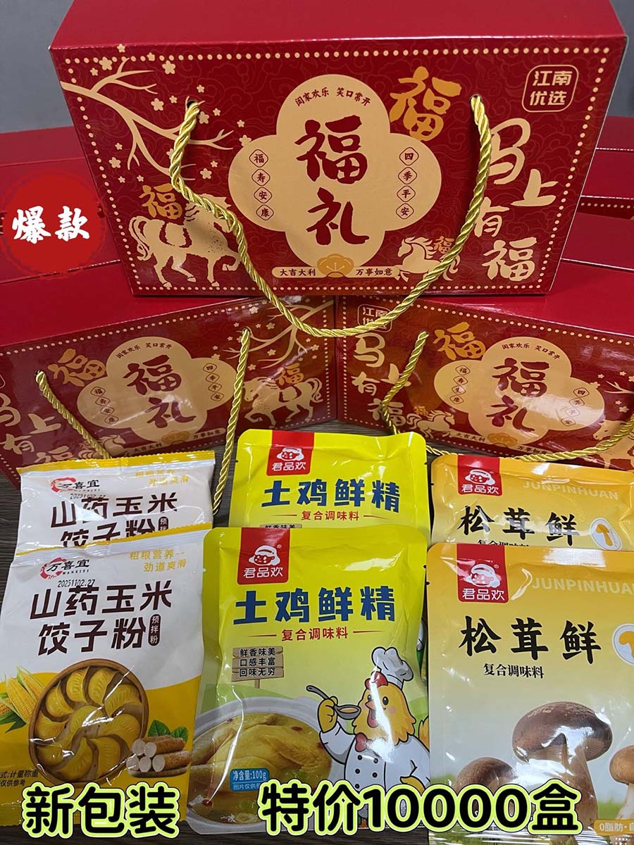??热卖爆款????????????马上有福六件套礼盒,鸡精??2袋,松茸鲜??2袋,山药玉米饺子粉??2袋,总计600克,送礼倍有面,只要几元钱,包邮