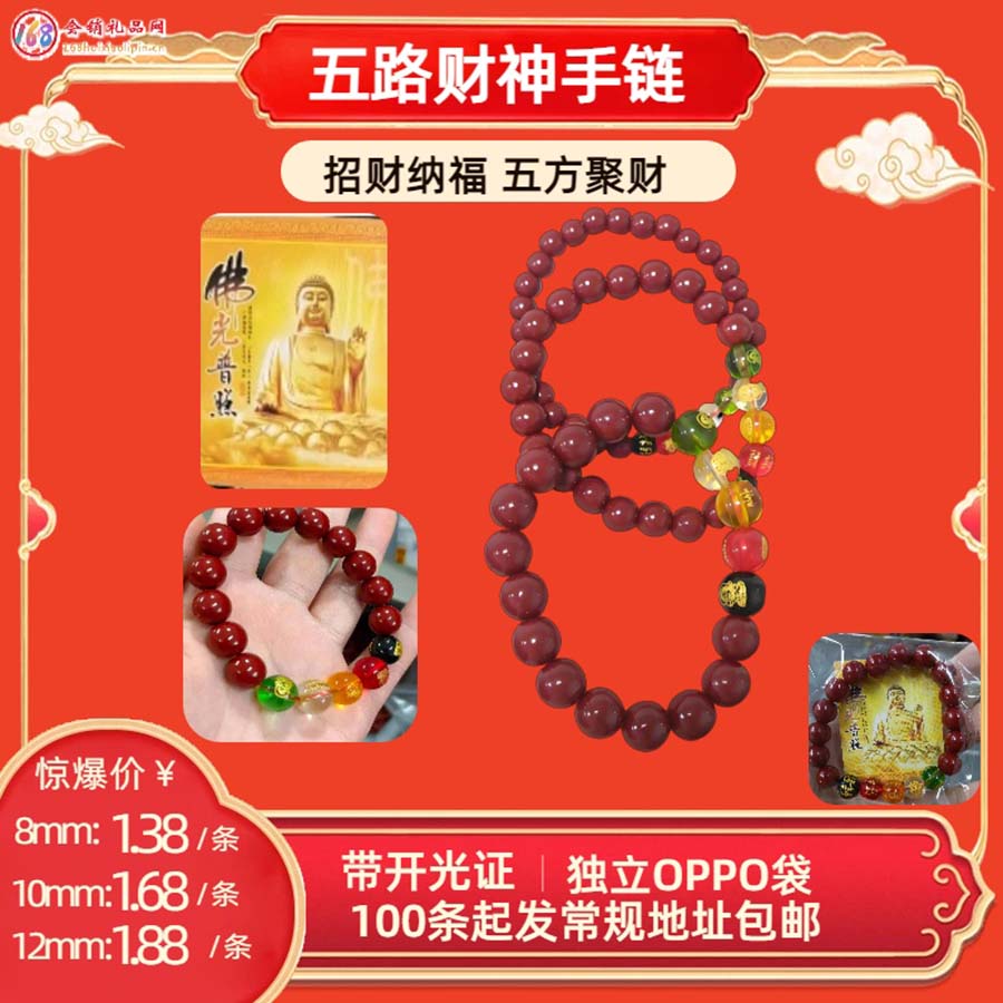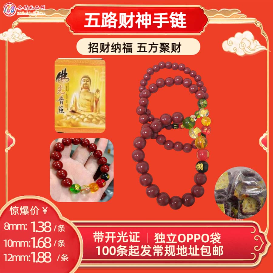 带开光证、配独立 OPPO 袋,100 条起发常规地址包邮。主打招财纳福、五方聚财,红珠搭彩石的设计适配祈财、礼赠场景。