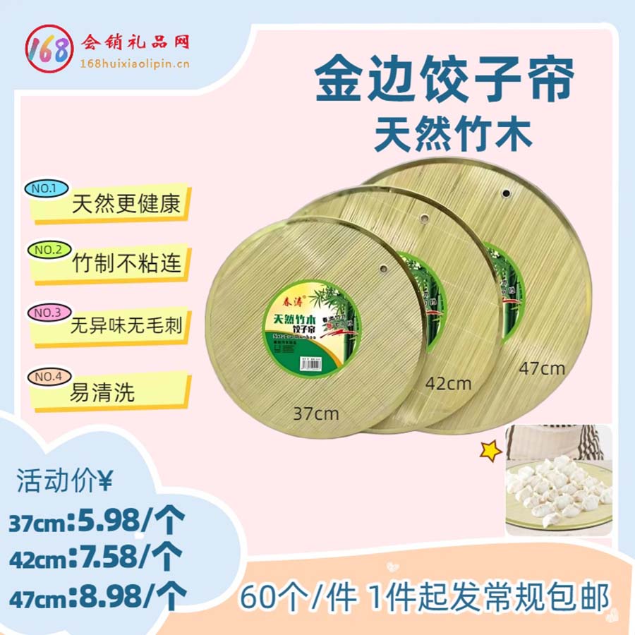 金边饺子帘,天然竹木材质,37cm 款 5.98 元 / 个、42cm 款 7.58 元 / 个、47cm 款 8.98 元 / 个,60 个 / 件且 1 件起发享常规包邮。