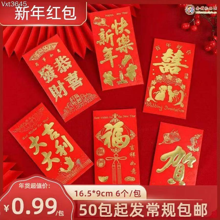 新年红包 年货超值价 0.99 元 / 包(每包 6 个,尺寸 16.5*9cm),50 包起发常规地区包邮!