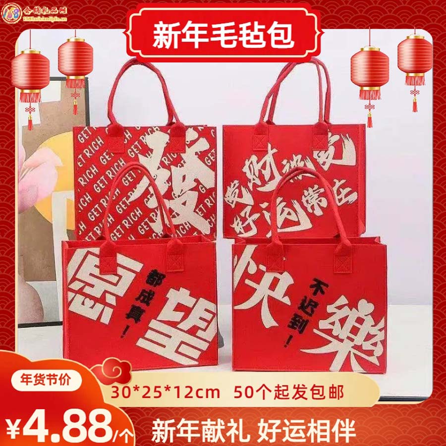 ??50 个起发包邮,喜庆红底配吉语,毛毡材质耐用装,年货包装 / 伴手礼袋超应景~