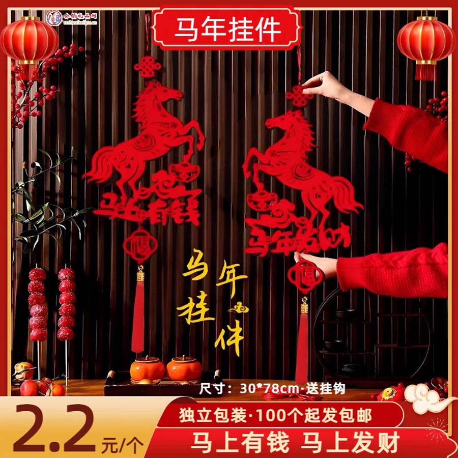 主体为马年生肖剪纸造型(含 “马上有钱”“马年发财” 吉祥语),搭配中国结与流苏挂绳设计,是烘托春节氛围的年俗装饰小物件。