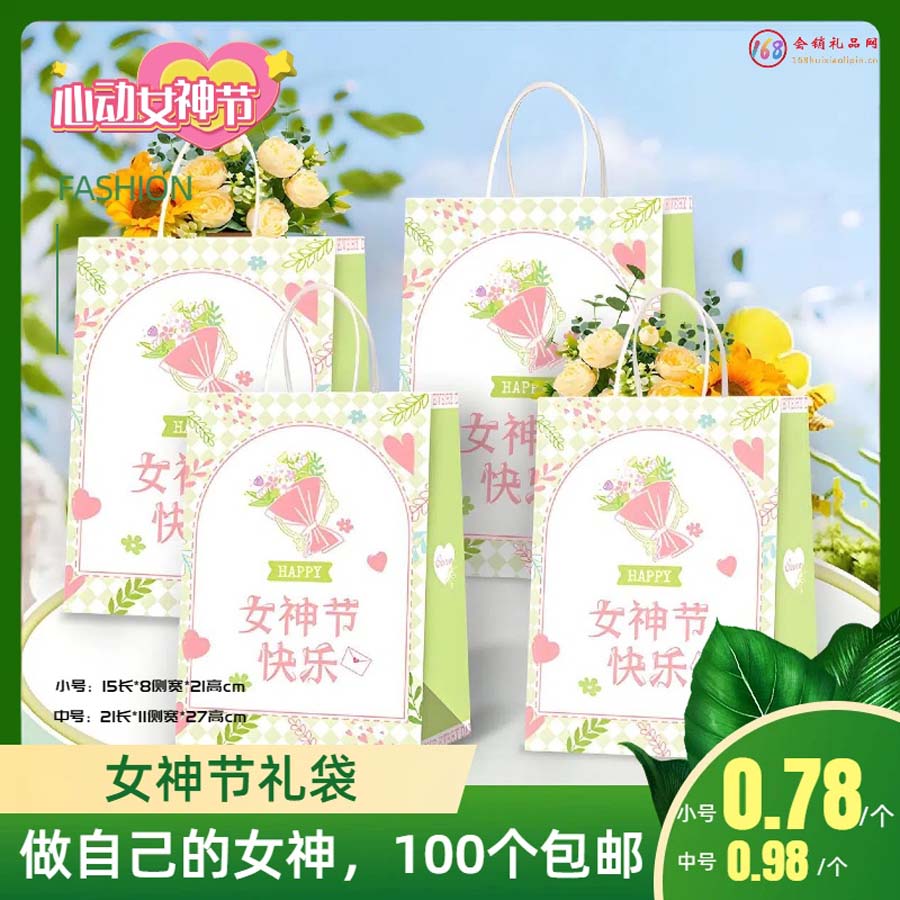 印 “女神节快乐” 主题文案,适配伴手礼、美妆等物品包装,是提升女神节礼赠仪式感的精致装饰袋单品。