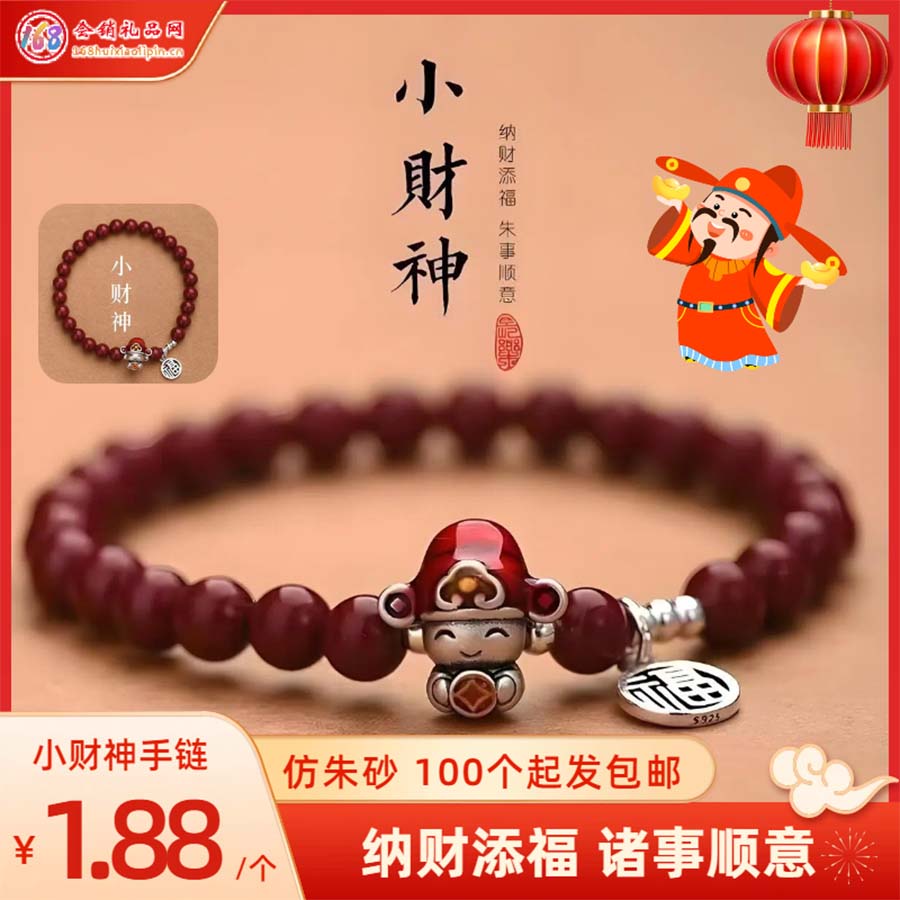 仿朱砂珠材质,搭配小财神造型配饰与 “福” 字挂坠,融合纳财添福的吉祥寓意,是适配新年场景的国风饰品小物件。