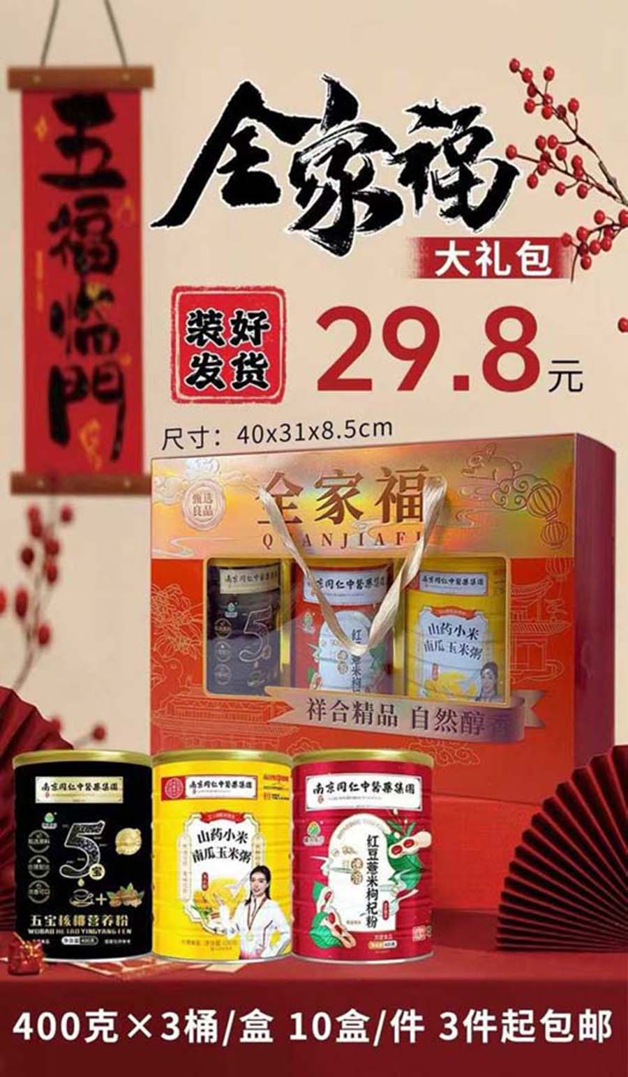 福瑞到,高端精美的全家福养生粉大礼包上线啦 ,装好发,含山药小米南瓜玉米粥+五宝核桃营养粉+红豆薏米枸杞粉,装好发货,30盒起包邮,10盒一件、 配有精美课件