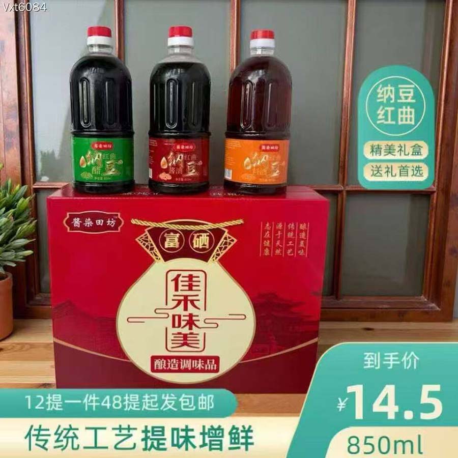850ml富硒纳豆红曲酱油富硒纳豆红曲醋富硒纳豆红曲料酒富硒调味品礼盒,,偏远除外。规格38*28*10传统工艺,自然鲜香,精美手提礼盒,送礼佳品。