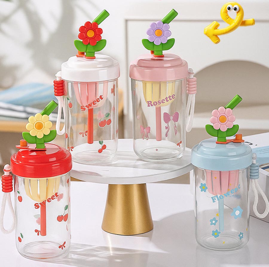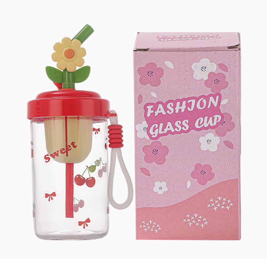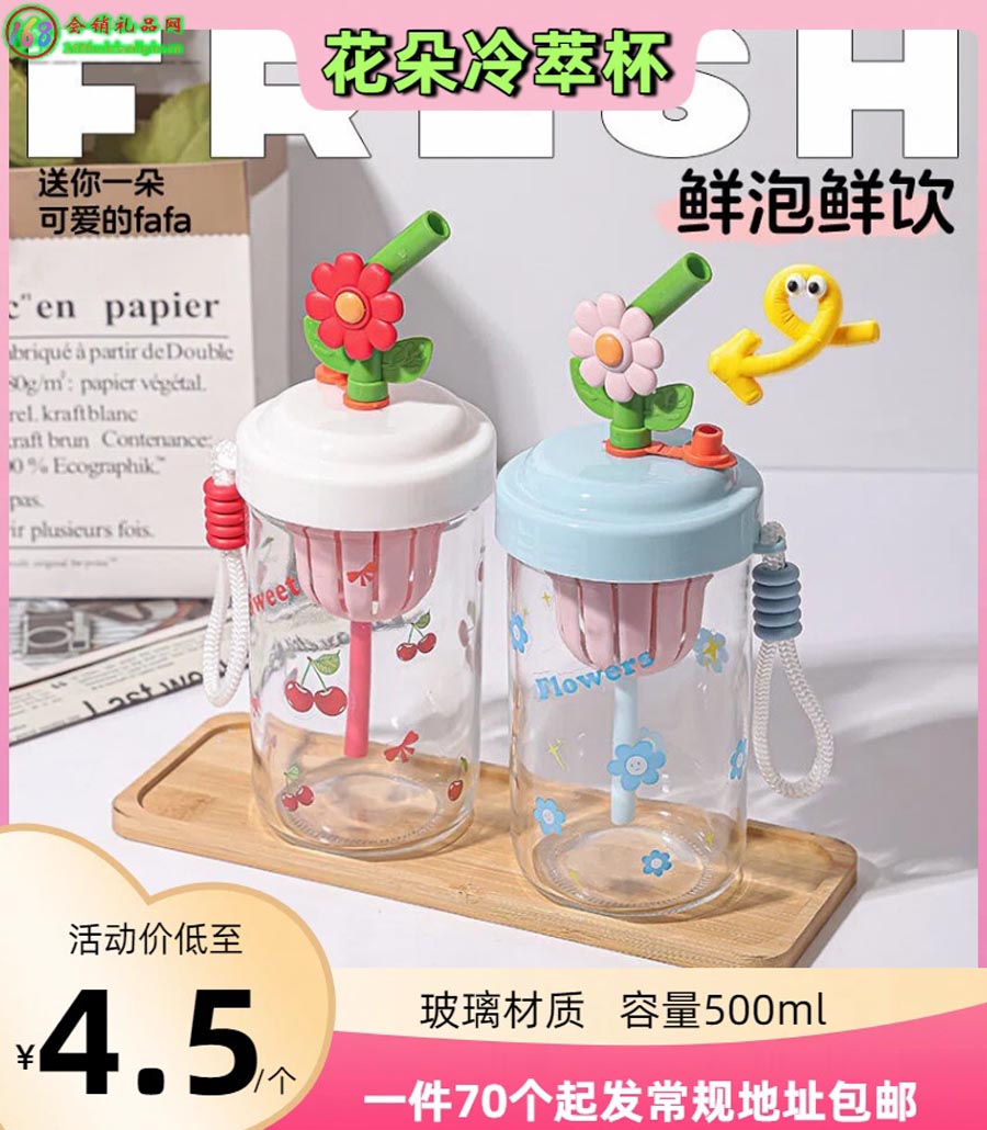 玻璃材质,安全通透, 可爱花朵造型,鲜泡鲜饮,自带冷萃茶隔 带吸管与便携挂绳,双色可选